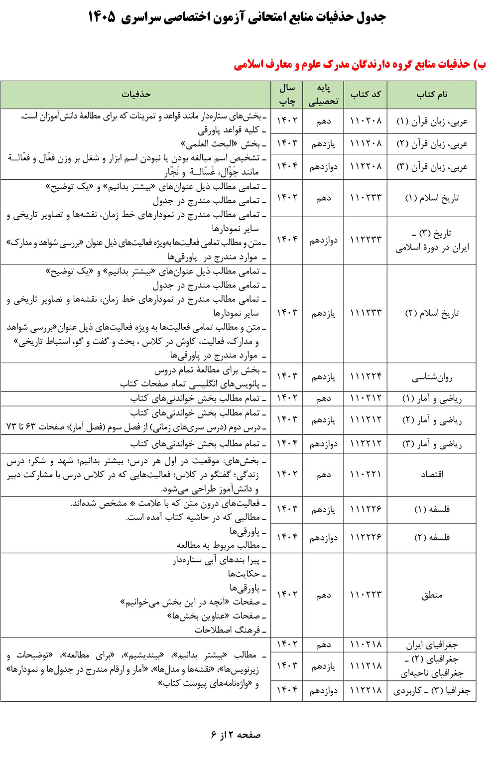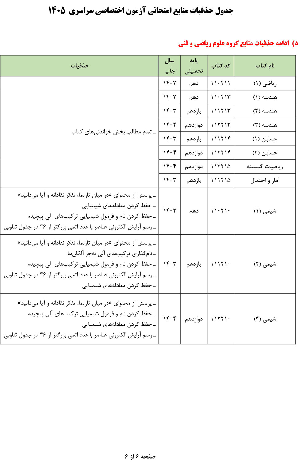 سازمان سنجش آموزش کشور فهرست نهایی حذفیات منابع امتحانی آزمون اختصاصی کنکور سراسری سال ۱۴۰۵ را منتشر کرد. بر اساس اطلاعیه رسمی این سازمان، داوطلبان میتوانند با مراجعه به ضمیمه اعلامشده، جزئیات دقیق حذفیات هر درس را مشاهده کنند.