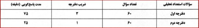 تعداد و ضرایب سؤالات آزمون و مدت زمان پاسخگویی به شرح جدول زیر است: