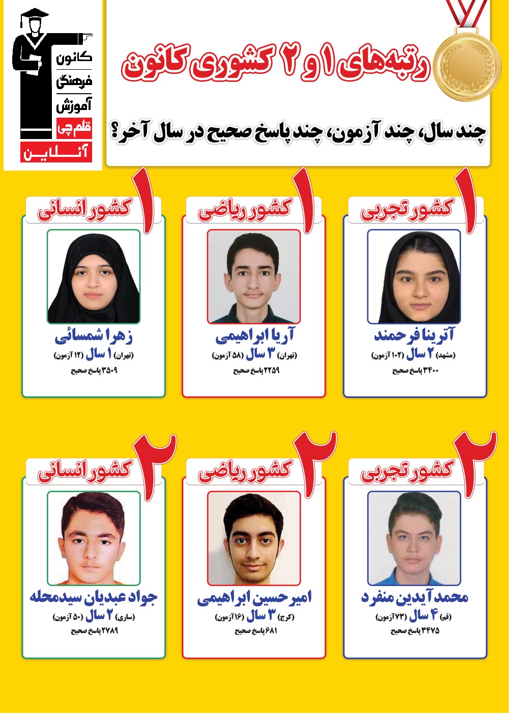 1- آریا ابراهیمی شیلا از تهران - 3 سال دانش آموز کانون (دهم ، یازدهم و دوازدهم) - 58 آزمون