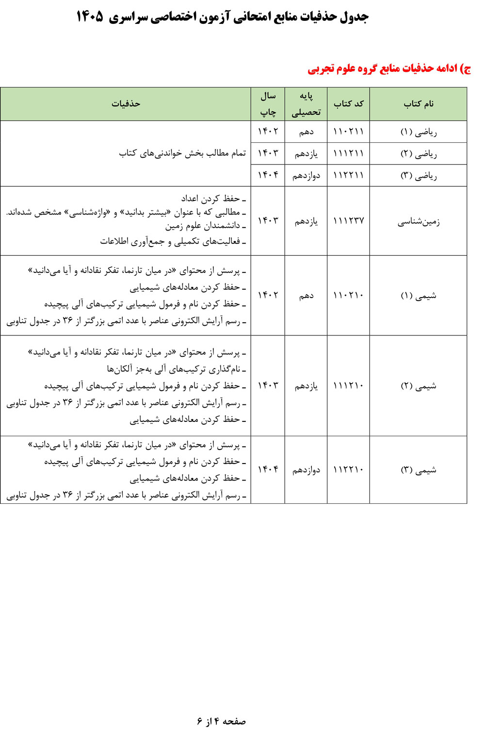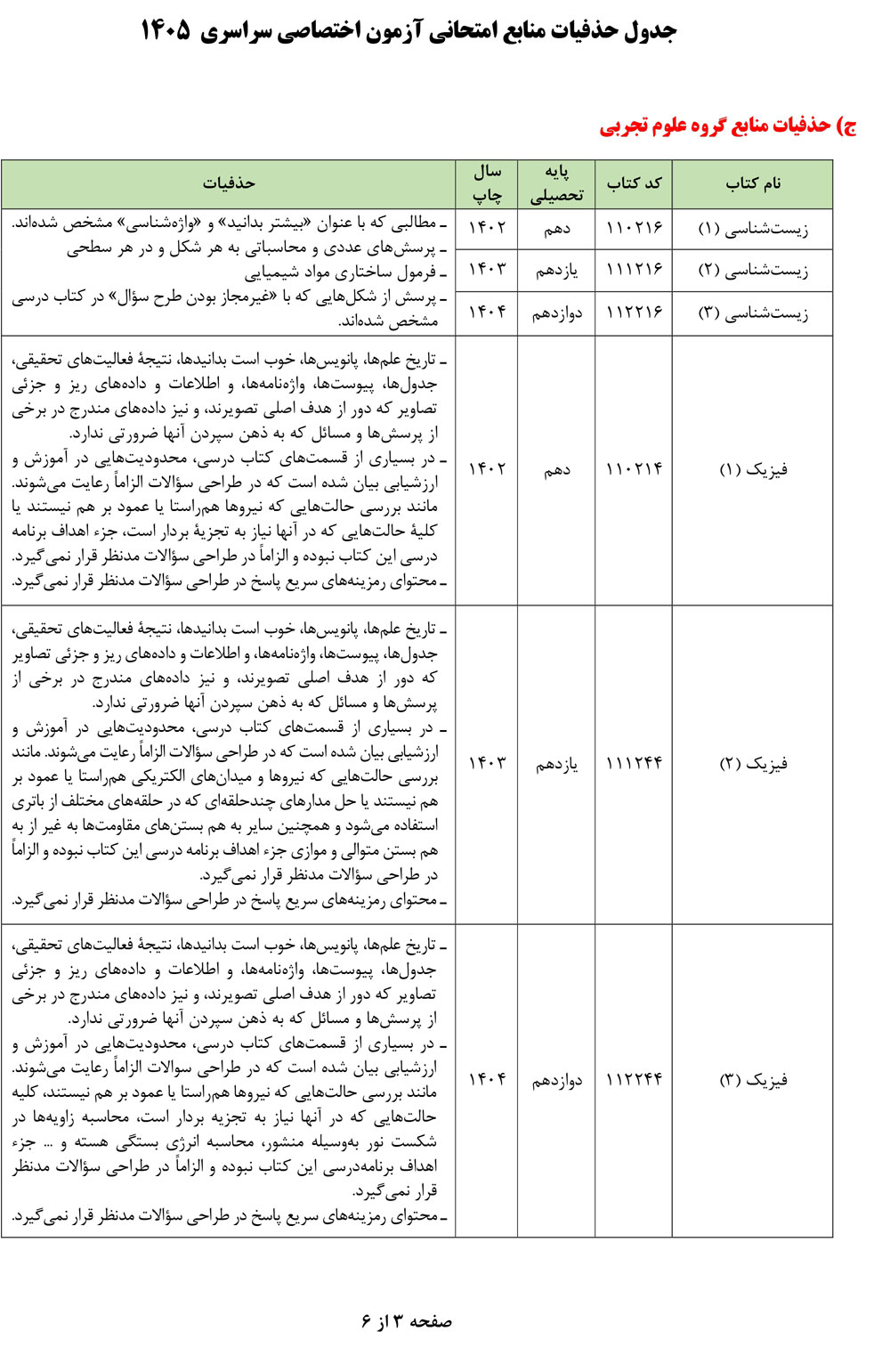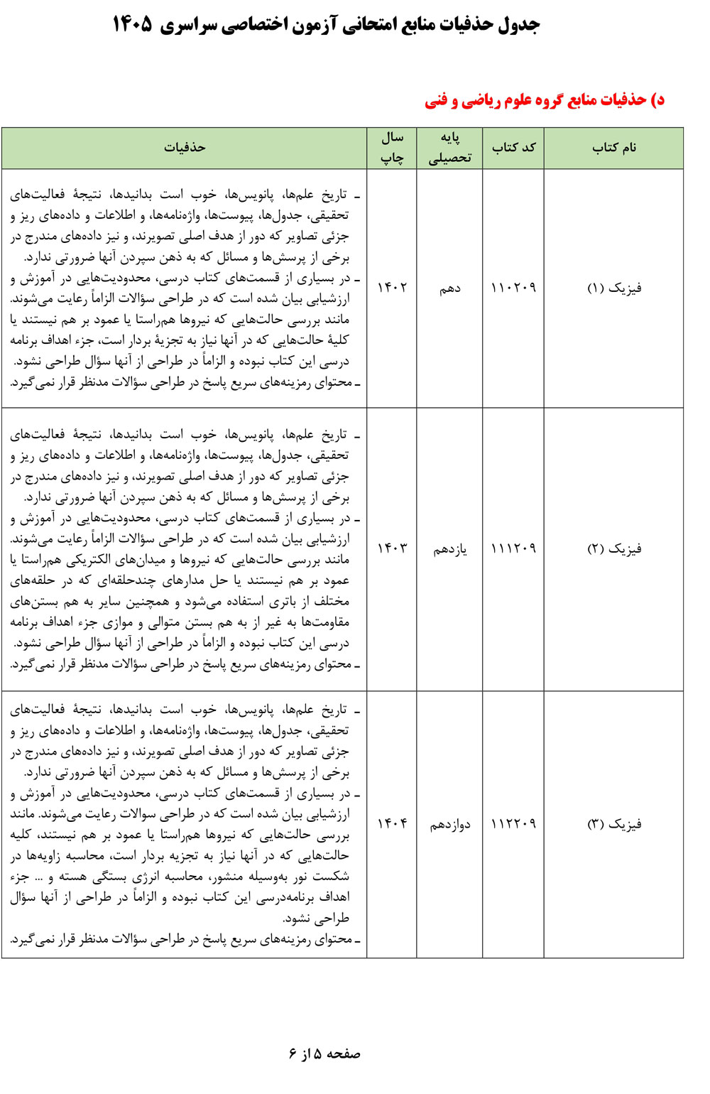 سازمان سنجش آموزش کشور فهرست نهایی حذفیات منابع امتحانی آزمون اختصاصی کنکور سراسری سال ۱۴۰۵ را منتشر کرد. بر اساس اطلاعیه رسمی این سازمان، داوطلبان میتوانند با مراجعه به ضمیمه اعلامشده، جزئیات دقیق حذفیات هر درس را مشاهده کنند.