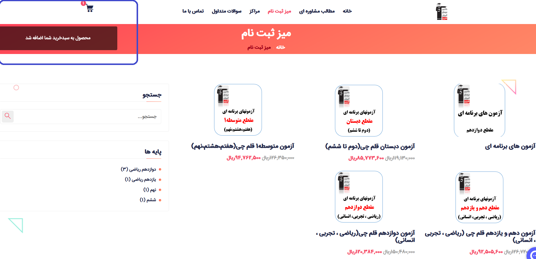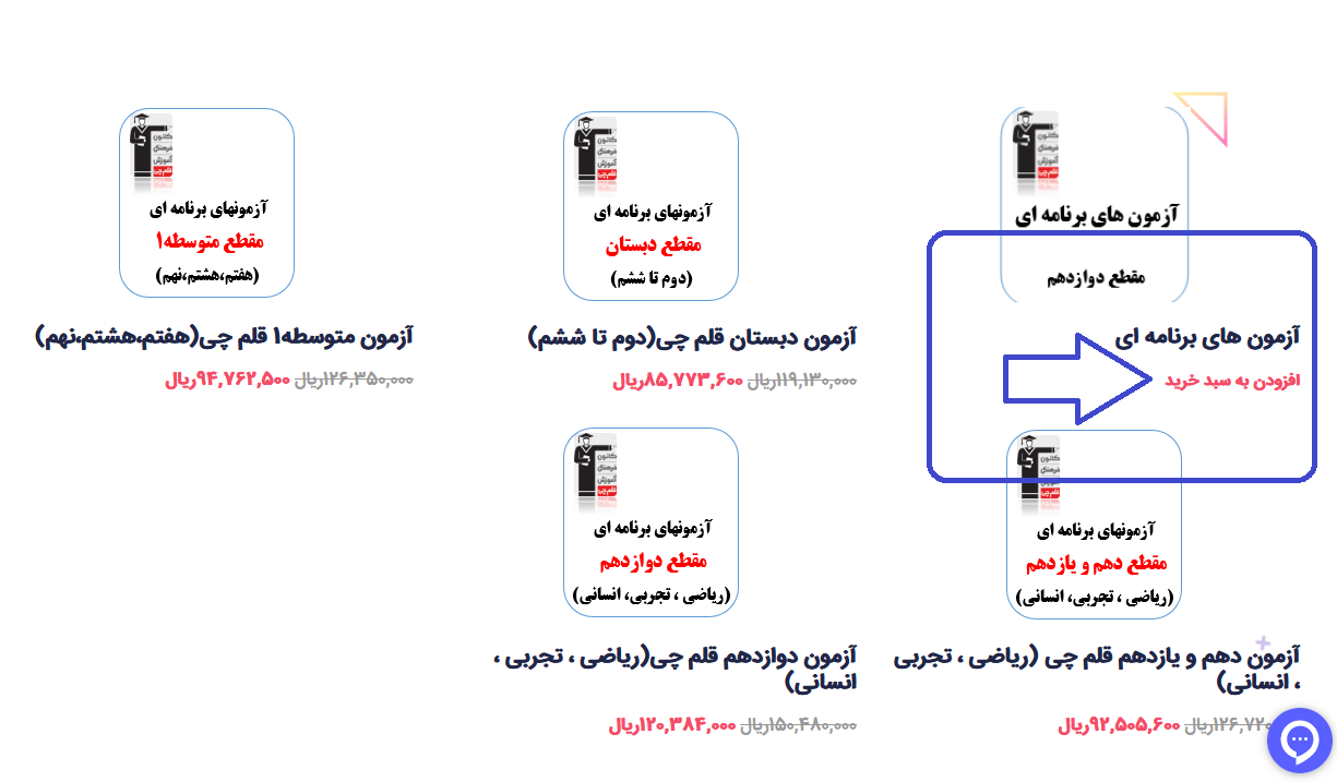 2 - با توجه به مقطع و تعداد آزمون ، بسته متناسب خود را انتخاب کنید ( در کامپیوتر و لپ تاپ با نگه داشتن نشانگر ماوس بر روی قیمت و در گوشی و تبلت با ضربه زدن بر روی قیمت گزینه افزودن به سبد خرید نمایان می شود) همچنین می توانید با کلیک بر روی عکس محصول وارد صفحه توضیحات محصول شوید و از انتهای صفحه گزینه افزودن به سبد خرید را انتخاب کنید.