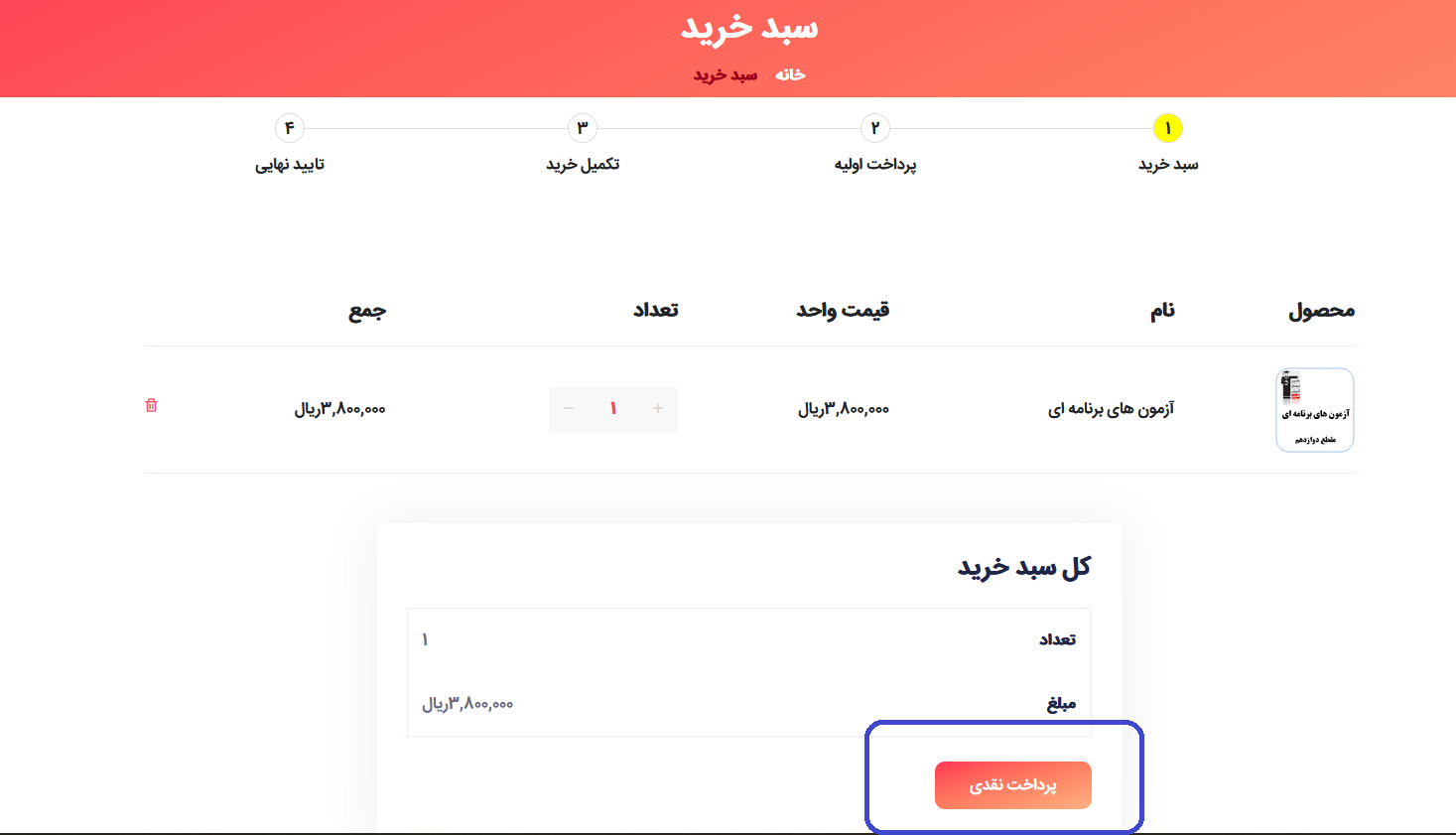 10 - در این مرحله محصولاتی که به سبد خرید اضافه کردید را مشاهده می کنید. جهت ادامه پرداخت نقدی را انتخاب کنید.