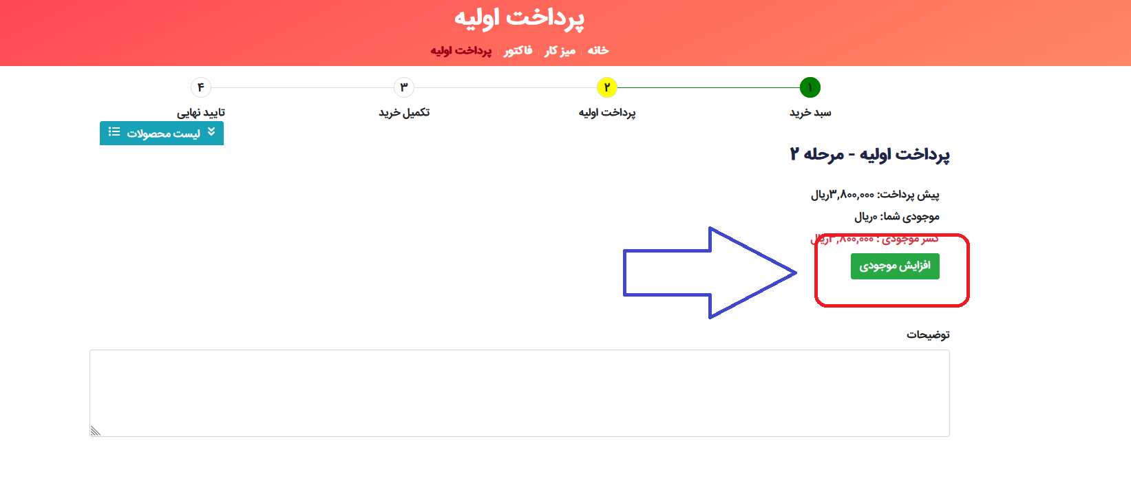 11 - وارد صفحه پرداخت اولیه می شوید و با انتخاب گزینه افزایش موجودی وارد درگاه پرداخت الکترونیک شوید