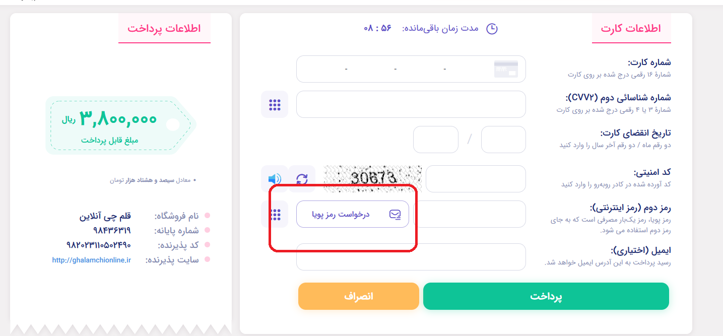 12- اطلاعات کارت بانکی خود را وارد و گزینه درخواست رمز پویا را انتخاب و رمز را وارد کنید تا پرداخت شما انجام شود.