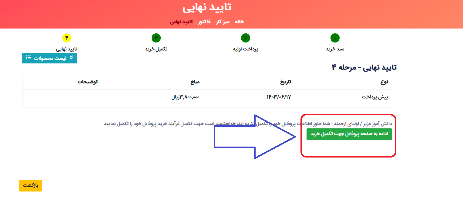 13 - وارد صفحه تائید نهایی می شوید. در این مرحله لازم است جهت تکمیل ثبت نام، پروفایل خود را تکمیل و ثبت نام خود را کامل کنید.گزینه ادامه به صفحه پروفایل جهت تکمیل خرید را انتخاب کنید.