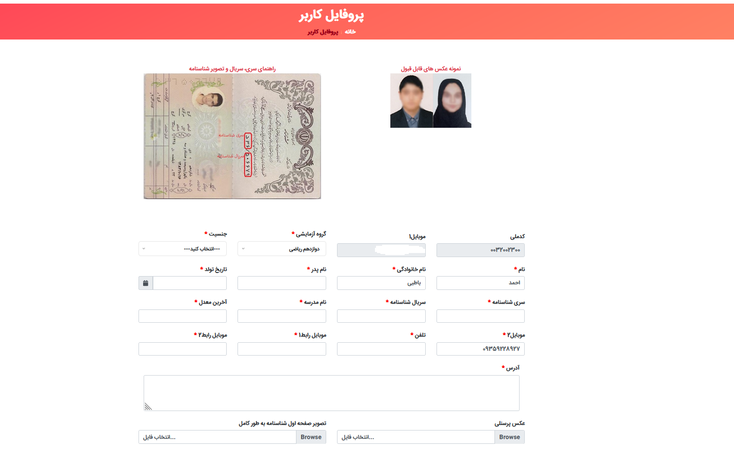 14 - وارد صفحه تکمیل پروفایل شوید اطلاعات خواسته شده را به دقت تکمیل و مدارک خواسته شده را بارگزاری کنید تا همکاران ما ثبت نام شما را تائید کنند.(نمونه ای از عکس پرسنلی و شناسنامه قابل قبول در سایت قرار گرفته است ، لطفا همانند نمونه مدارک را بارگزاری کنید)