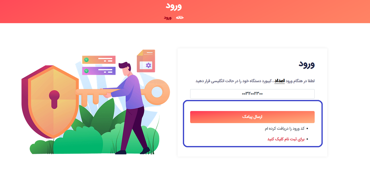 7 - پس از ثبت نام به صفحه ورود هدایت می شود و با زدن گزینه ارسال پیامک رمز عبور به شماره موبایل شما ارسال می شود.