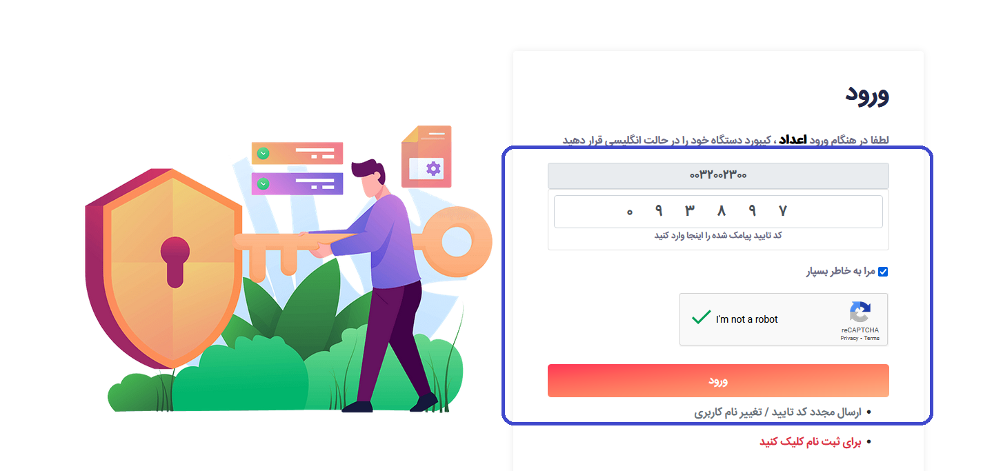 8 - کد دریافتی را وارد کنید و گزینه I'm not a robot را تیک بزنید و ورود را انتخاب کنید(توجه داشته باشید در صورتی که با گوشی تلفن همراه وارد شدید هنگام ورود اعداد صفحه کلید دستگاه خود را در حالت انگلیسی قرار دهید)